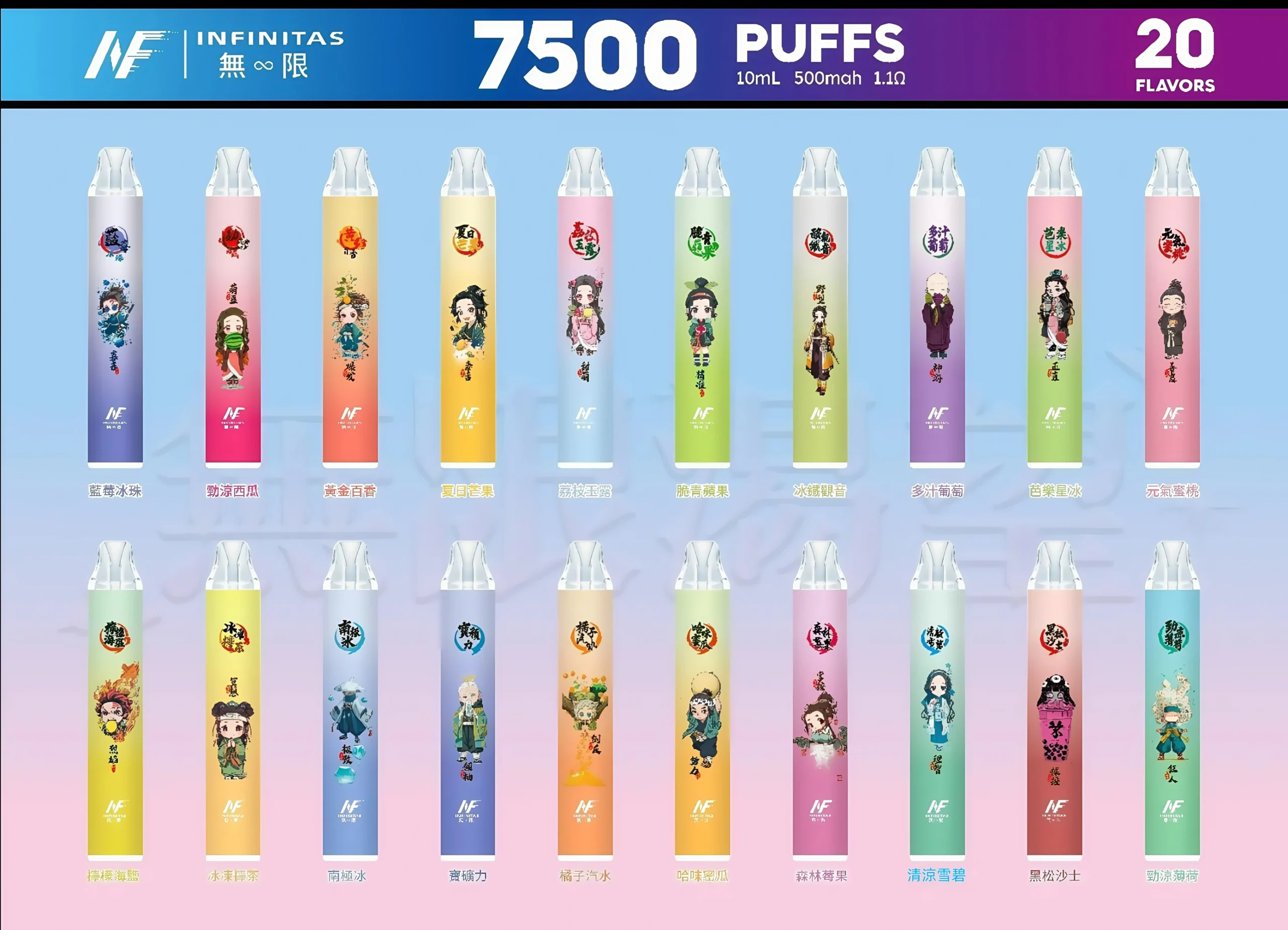 INF無限7500口拋棄式電子煙全新登場!這款產品將人氣動漫元素與高性能電子煙技術結合,專為追求持久續航與獨特設計的玩家打造。內建500mAh可充電電池搭配10ml大容量煙油,單支即可帶來高達7500口吸。加上1.1Ω網狀線圈,煙霧更細緻、風味更還原,讓每一口都保持穩定享受。